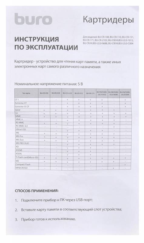 | Питание картридера: | USB |