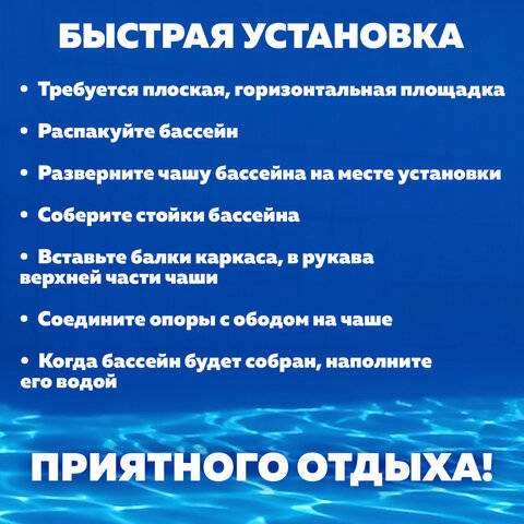 Не требует бетонирования и подготовки ямы: все, что нужно – это плоская, горизонтальная площадка. Сезонный бассейн (рекомендуется разбирать на холодное время года) обладает простой конструкцией и может быть легко разобран и собран заново. Время сборки и подключения бассейна составляет около 30 минут.