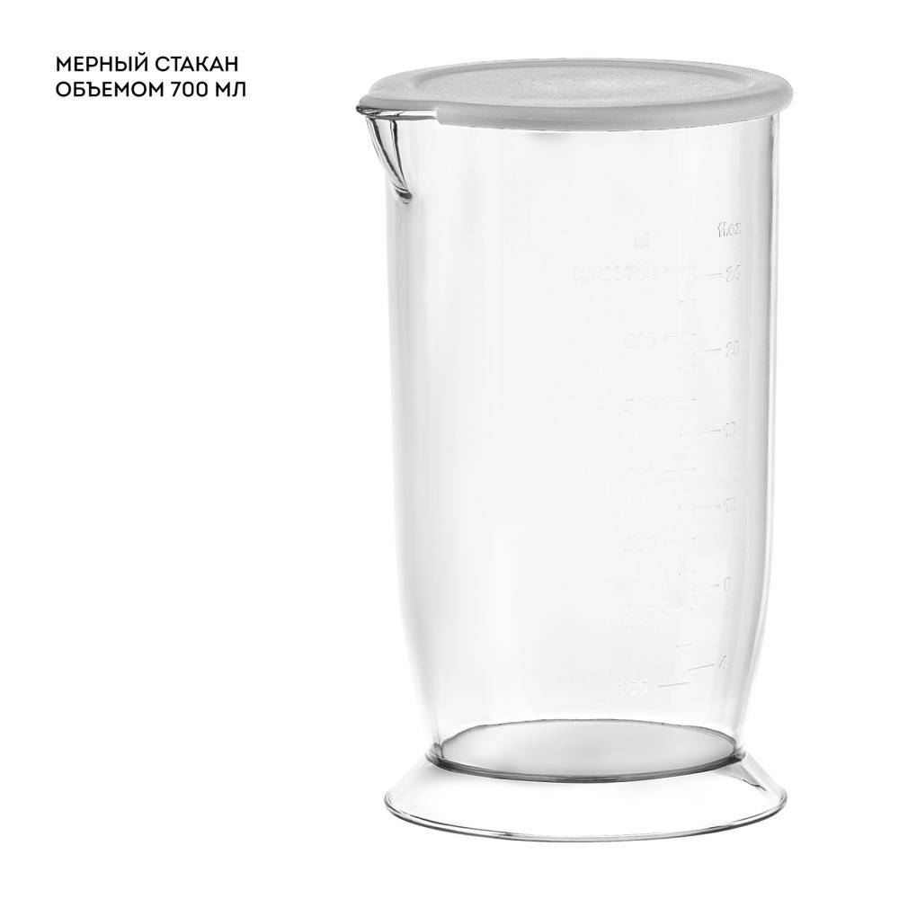 Мерный стакан объемом 700 мл удобен как для измерения объема жидкостей и сыпучих продуктов, так и для взбивания в нем кремов, муссов, соусов, жидкого теста и др.