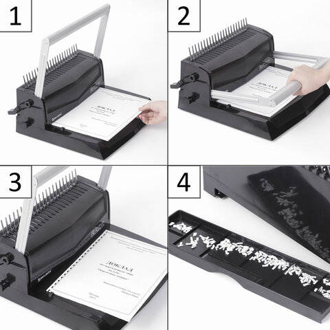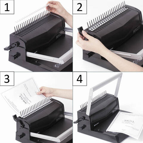 Пробивает и переплетает листы формата А3 по короткой стороне, А4, А5, А6, А7 и ниже – по длинной стороне.