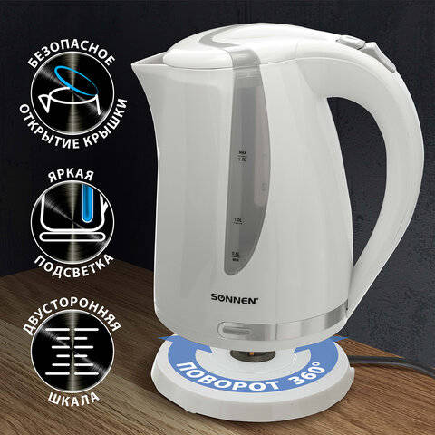 Чайник/Термопот SONNEN Чайник KT-1743, 1,7 л, 2200 Вт, закрытый нагревательный элемент, пластик, белый, 453414