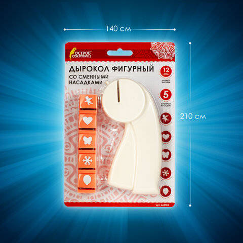 Фигурный дырокол ОСТРОВ СОКРОВИЩ - незаменимый и очень простой инструмент для детского и взрослого творчества. Используется для создания аппликаций, оформления открыток, скрап-альбомов, пригласительных, а также для изготовления конфетти. В набор входят 5 насадок с различными вырубками: сердечко, ангел, бабочка, снежинка, воздушный шарик. Вырубки можно использовать совместно для создания других интересных рисунков. Подробная инструкция размещена на обратной стороне упаковки.