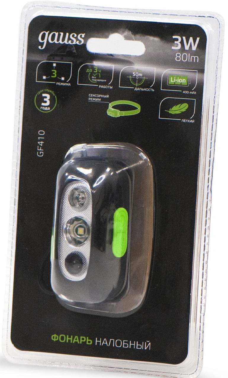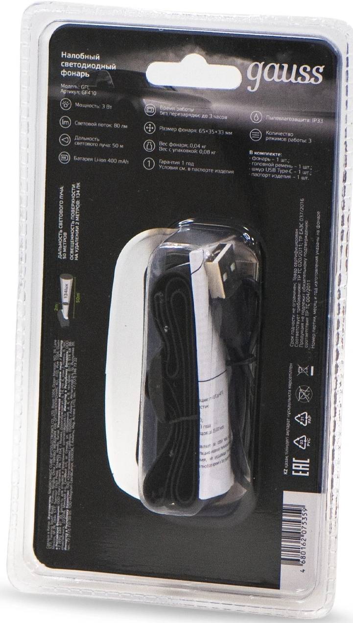 Фонарь GAUSS налобный GFL410 черный 3Вт лам.:светодиод. встроенный аккумулятор