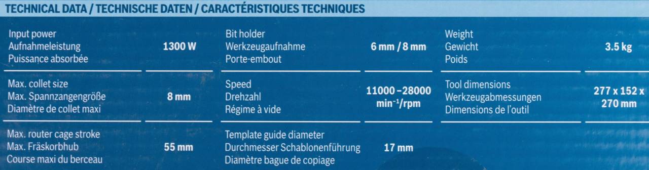 Комплектация:Затяжной ключ, параллельный упор, копировальная втулка, патрубок для пылесоса, центрирующий штифт, направляющий ролик, цанговый патрон 6 мм, цанговый патрон 8 мм.