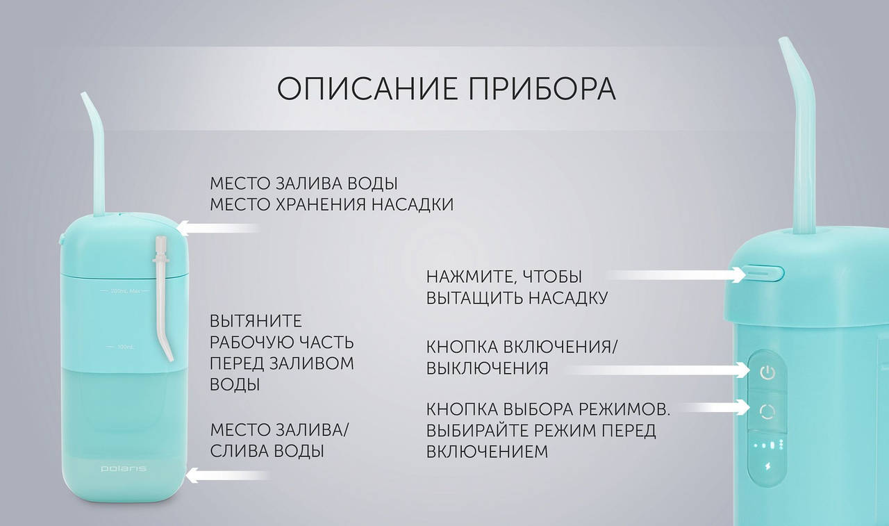 Особенности:Складной портативный ирригатор. Макс. давление струи - 720 кПа. Объем резервуара 200 мл.