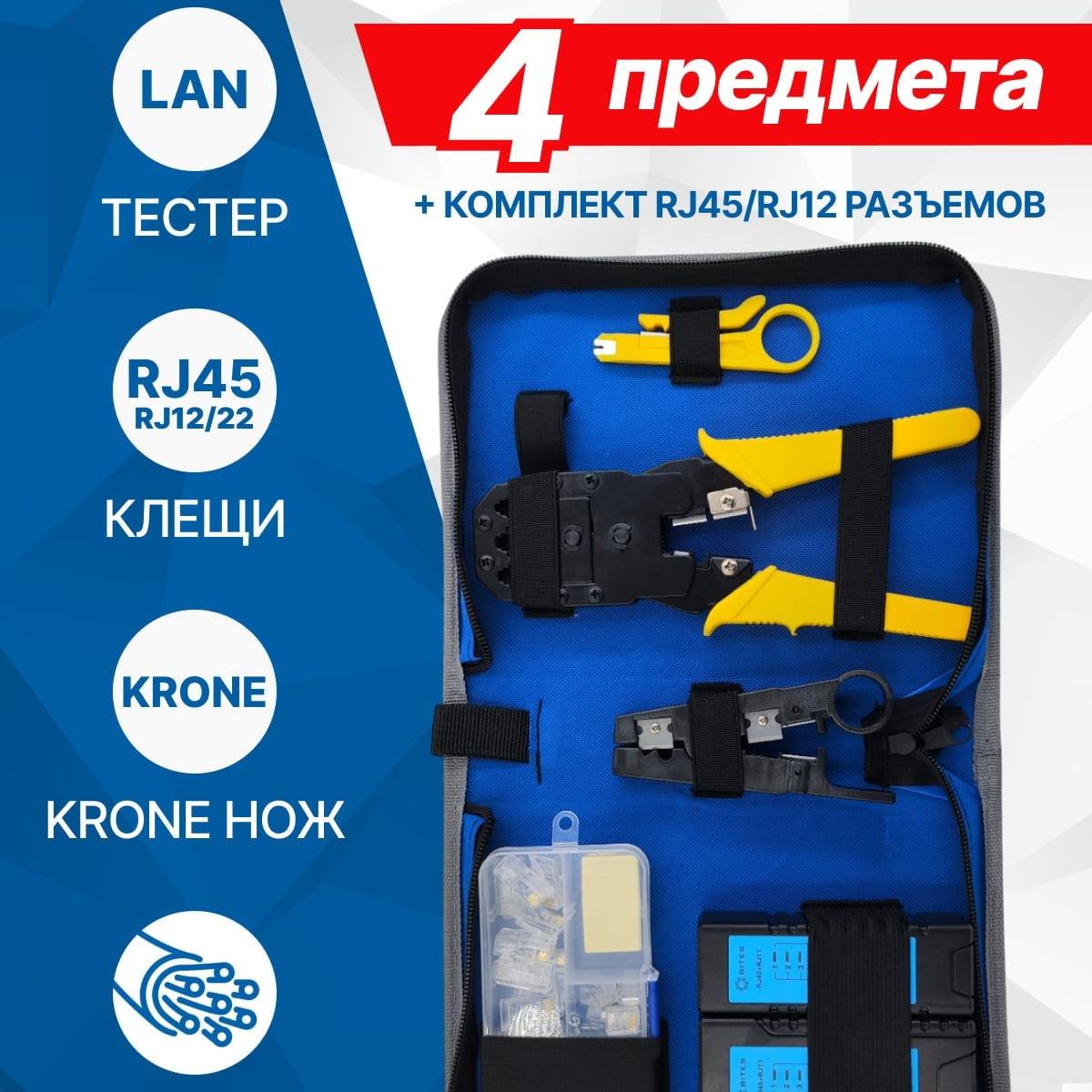 Прочее:LAN тестер, Инструмент для заделки витой пары, Инструмент для зачистки витой пары, Инструмент обжимной