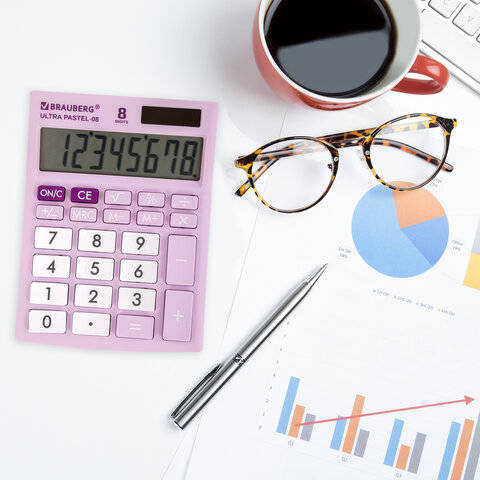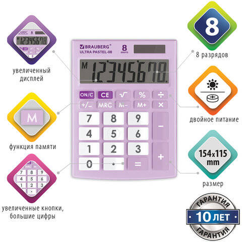 Калькулятор Brauberg настольный ULTRA PASTEL-08-PR, КОМПАКТНЫЙ , 8 разрядов, двойное питание, СИРЕНЕВЫЙ, 250516