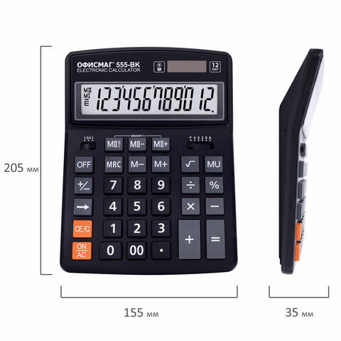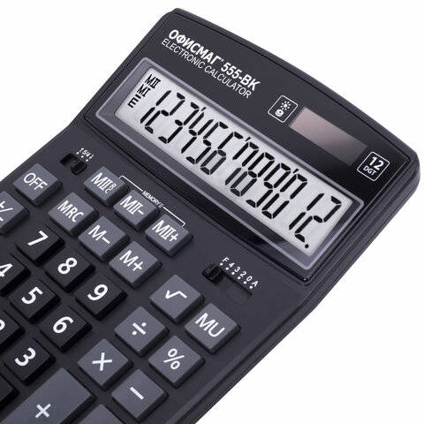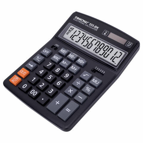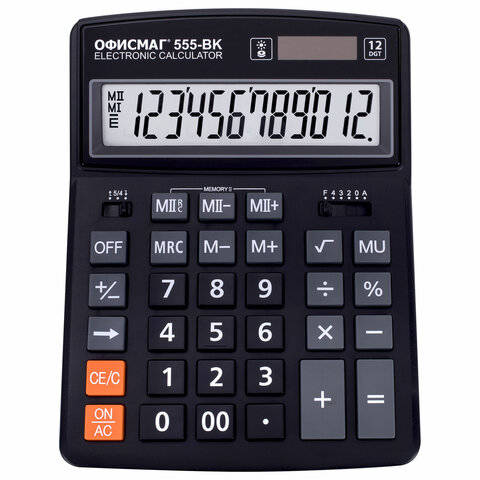 Калькулятор ОФИСМАГ настольный 555-BK , 12 разрядов, двойное питание, ЧЕРНЫЙ, 271729