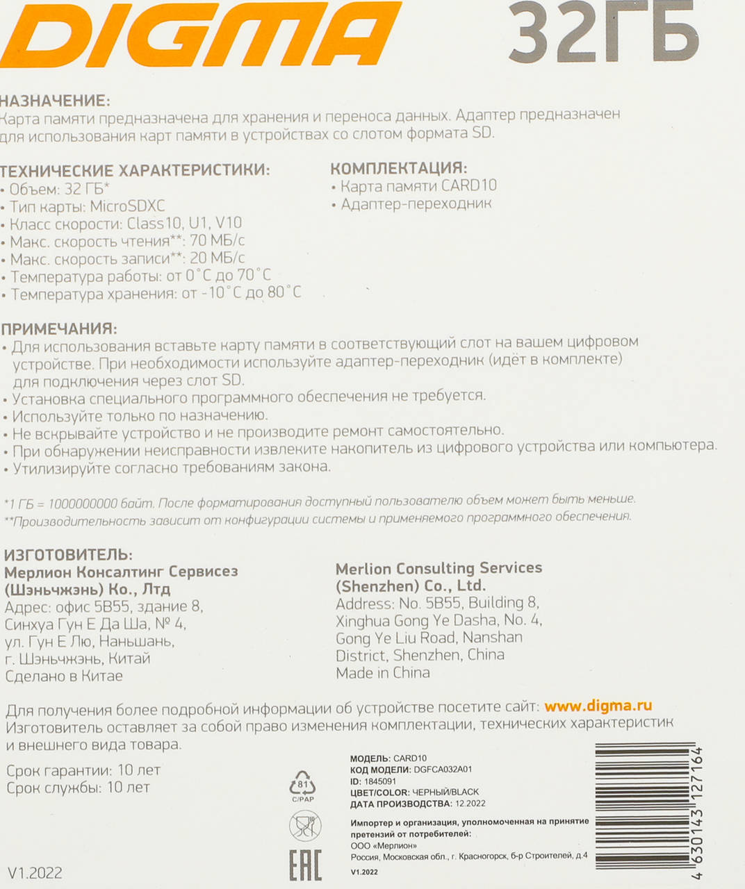 Карта памяти Digma Флеш карта microSDHC 32GB CARD10 V10 + adapter