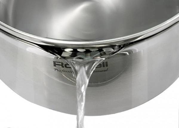 Нерж. сталь 18/10. Тройное дно без воздушных полостей. Оригинальный дизайн крышки для удобного слива жидкости без дуршлага. Ручки из бакелита с покрытием soft touch. Внутренние отметки литража. Для всех видов плит, включая индукционные. Гарантия на сталь – 25 лет
