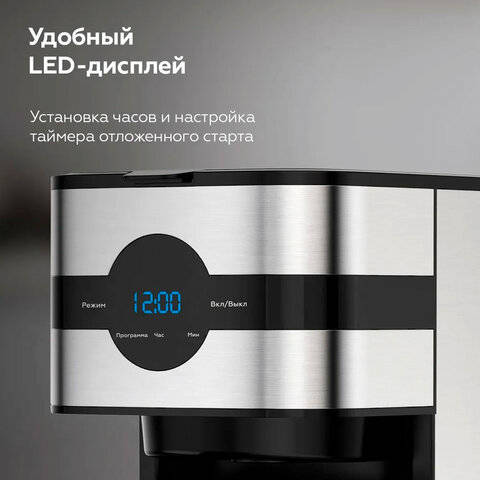 Удобные часы и таймер отложенного старта помогут вам заранее запланировать время заваривания, чтобы насладиться свежеприготовленным кофе прямо с утра.