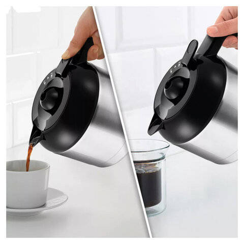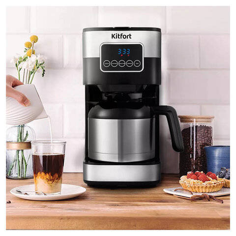 Капельная кофеварка Kitfort KT-752 поможет приготовить ароматный кофе из молотого кофе. Она компактная и простая в использовании. Кофеварка идеально подойдёт для приготовления кофе в домашних условиях или в офисе. Кофеварка имеет объём 1,25 л, что позволяет приготовить до 10 чашек за раз — идеально для семьи или команды на работе. Благодаря режиму автозапуска вы можете заранее установить время приготовления, и кофеварка включится сама — вы проснётесь под аромат свежесваренного кофе. Нагревательная пластина отсутствует: вместо этого используется термос-кофейник с термоизолированными стенками, который сохраняет температуру напитка до двух часов. Чтобы налить кофе, достаточно нажать на ручку — она открывает клапан, закрытый в обычном положении для сохранения тепла.