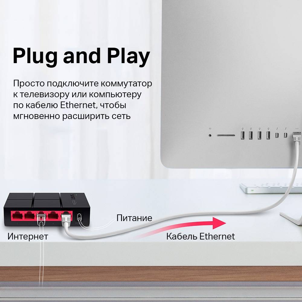 5-портовый 10/100/1000 Мбит/с настольный коммутатор 5 портов 10/100/1000 Мбит/с (RJ45) с автосогласованием и поддержкой Auto MDI/MDIX Удобное расширение проводной сети Компактный дизайн для удобного размещения Поддержка Plug and Play, дополнительная настройка не требуется Энергосберегающая технология позволяет сэкономить до 82%* потребляемой электроэнергии