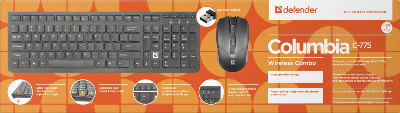 Комплект (клавиатура+мышь) DEFENDER Defender Беспроводной набор Columbia C-775 RU,черный,мультимедиа (45775)