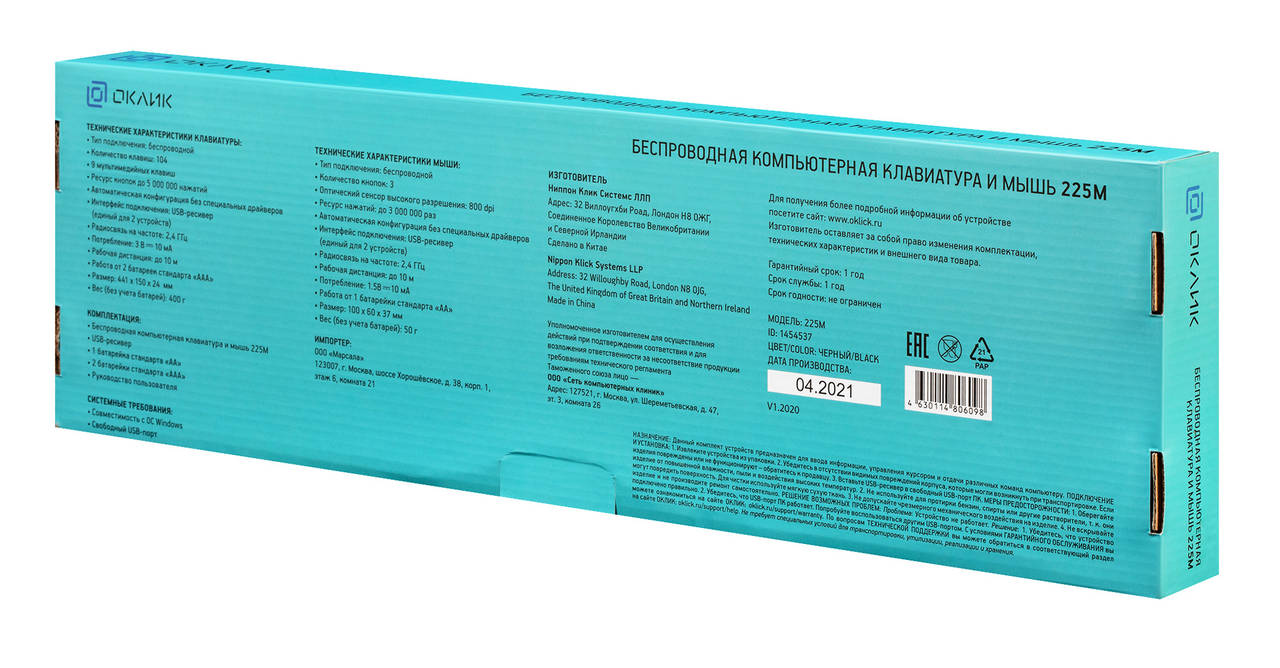 Комплект поставки: | Беспроводная компьютерная клавиатура и мышь 225M, батарейки, USB-ресивер |