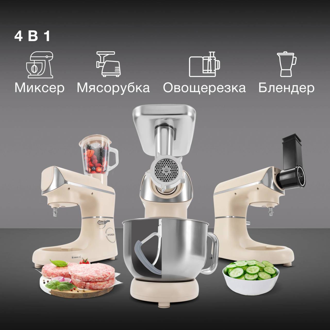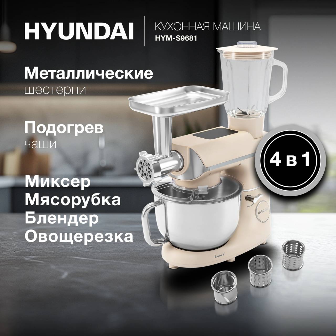 Кухонная машина HYUNDAI HYM-S9681 планетар.вращ. 1500Вт бежевый