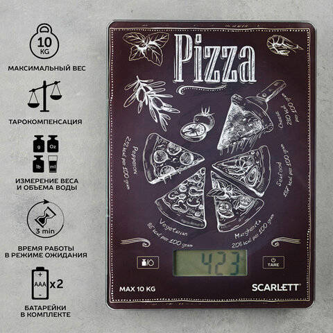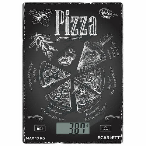 Весы SCARLETT SC-KS57P66 с изображением пиццы станут стильным акцентом на кухне. Модель выполнена из ударопрочного пластика и позволяет взвешивать продукты массой до 10 кг.