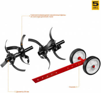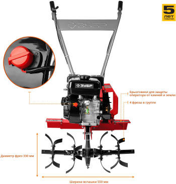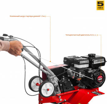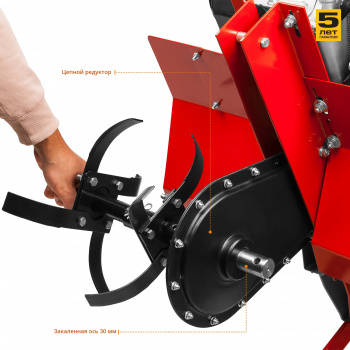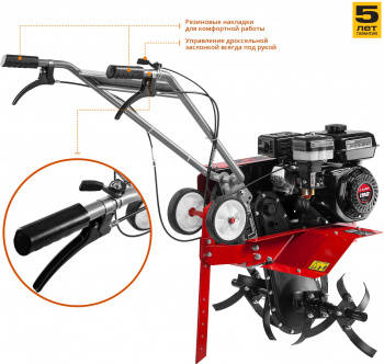 4-х тактный двигатель - для качественной работы; Регулировка руля под рост оператора - для удобства; Сошник - для регулировки глубины вспахивания; Реверс - для вытаскивания застрявшего культиватора. |