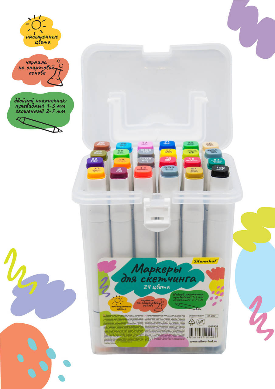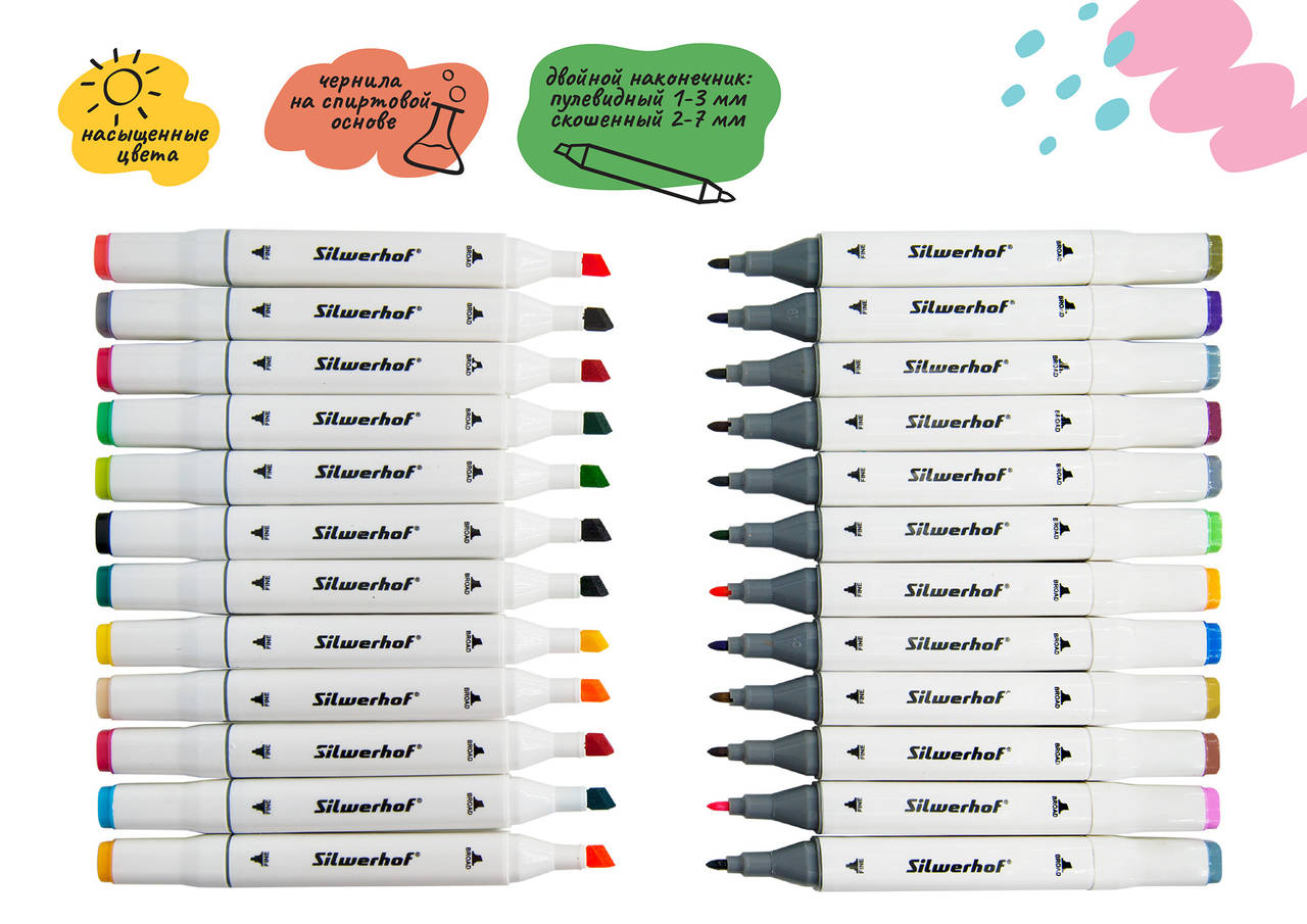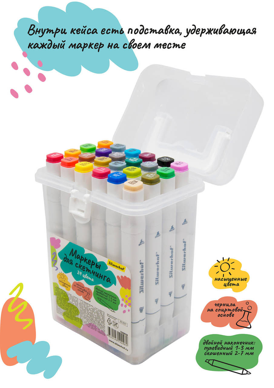 Маркер SILWERHOF Набор маркеров для скетчинга двойной пиш. наконечник 1-7мм 24цв. пластиковая коробка