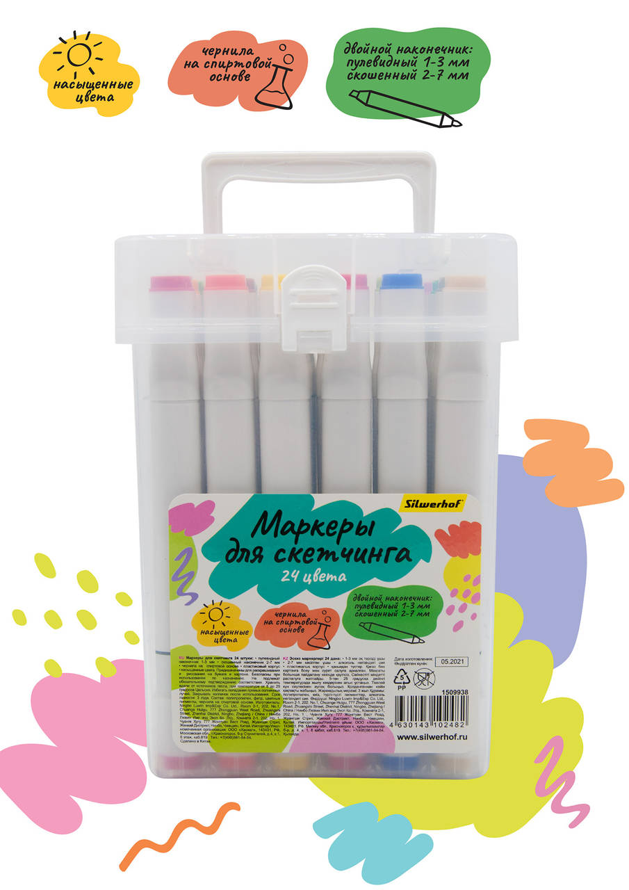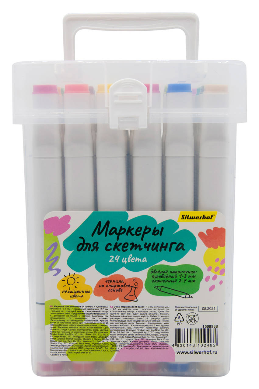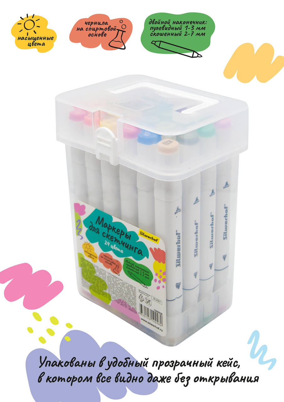 Маркер SILWERHOF Набор маркеров для скетчинга двойной пиш. наконечник 1-7мм 24цв. пластиковая коробка