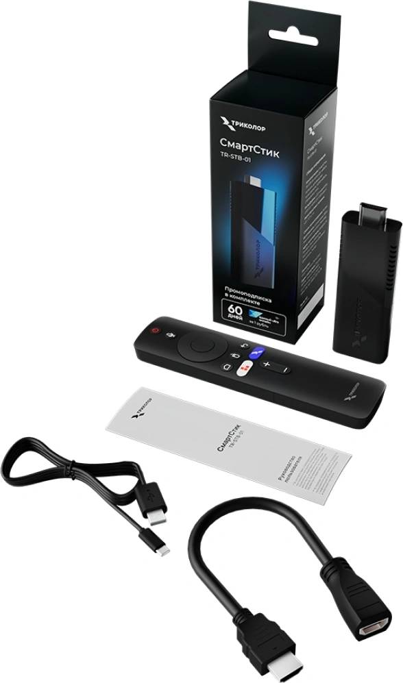 Комплектация: | Триколор СмартСтик, Пульт дистанционного управления, 2x батарейки ААА, Руководство пользователя, HDMI-кабель, Кабель питания (USB – USB type C), Вкладыш с промо-подпиской, Упаковка в новом фирменном дизайне «Триколор» |