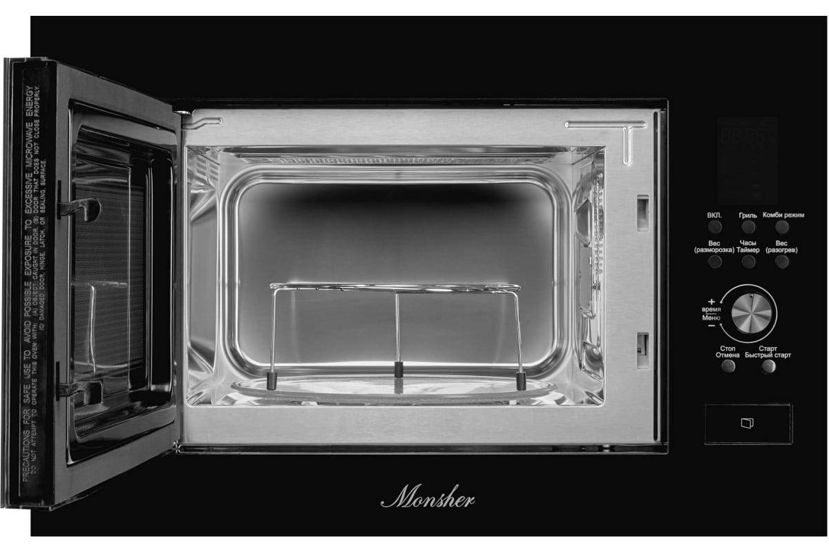 Необычный дизайн встраиваемой микроволновой печи Monsher MMH 2050 B чёрного цвета, прямо указывает на стиль Hi-Tech, использованный при разработке этого кухонного агрегата. Его мощность составляет 1400 Вт, что является отличным показателем для данной модели СВЧ-печи. К его возможностям стоит отнести не только обычное приготовление блюд, но и функцию гриля.
