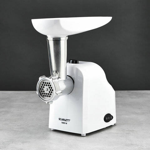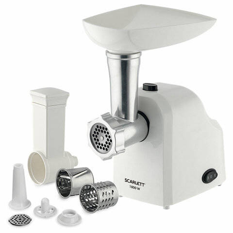 Мясорубка SCARLETT SC-MG45M20, 1800 Вт, производительность 2 кг/мин, 4 насадки, реверс, пластик, белая