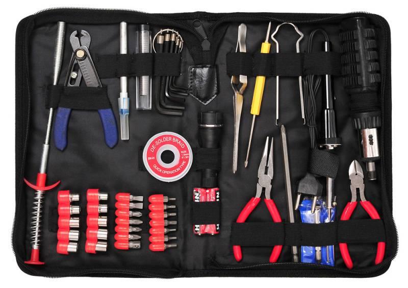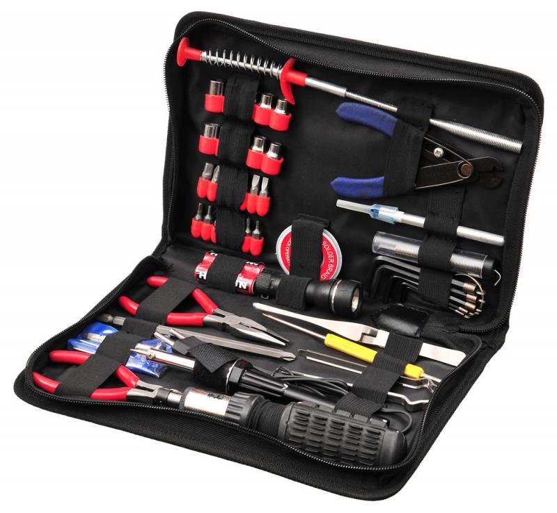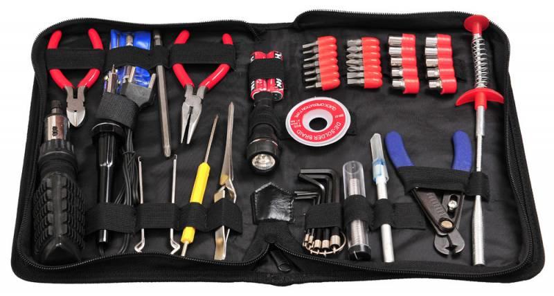 | Описание: | Реверс. отвертка с 14 жалами и 10 торц. ключами. Пассатижи 135мм. Кусачки 120мм. Часовая отвертка с 5 жалами. Отвертка с 2 жалами: 70х3 прямое и 20х3 крестовое. Пинцет. Шестигранные ключи. Экстрактор для микросхем. Паяльник. Припой. Фитиль для припоя. Зацеп. Инструмент для разделки кабеля. Скальпель |