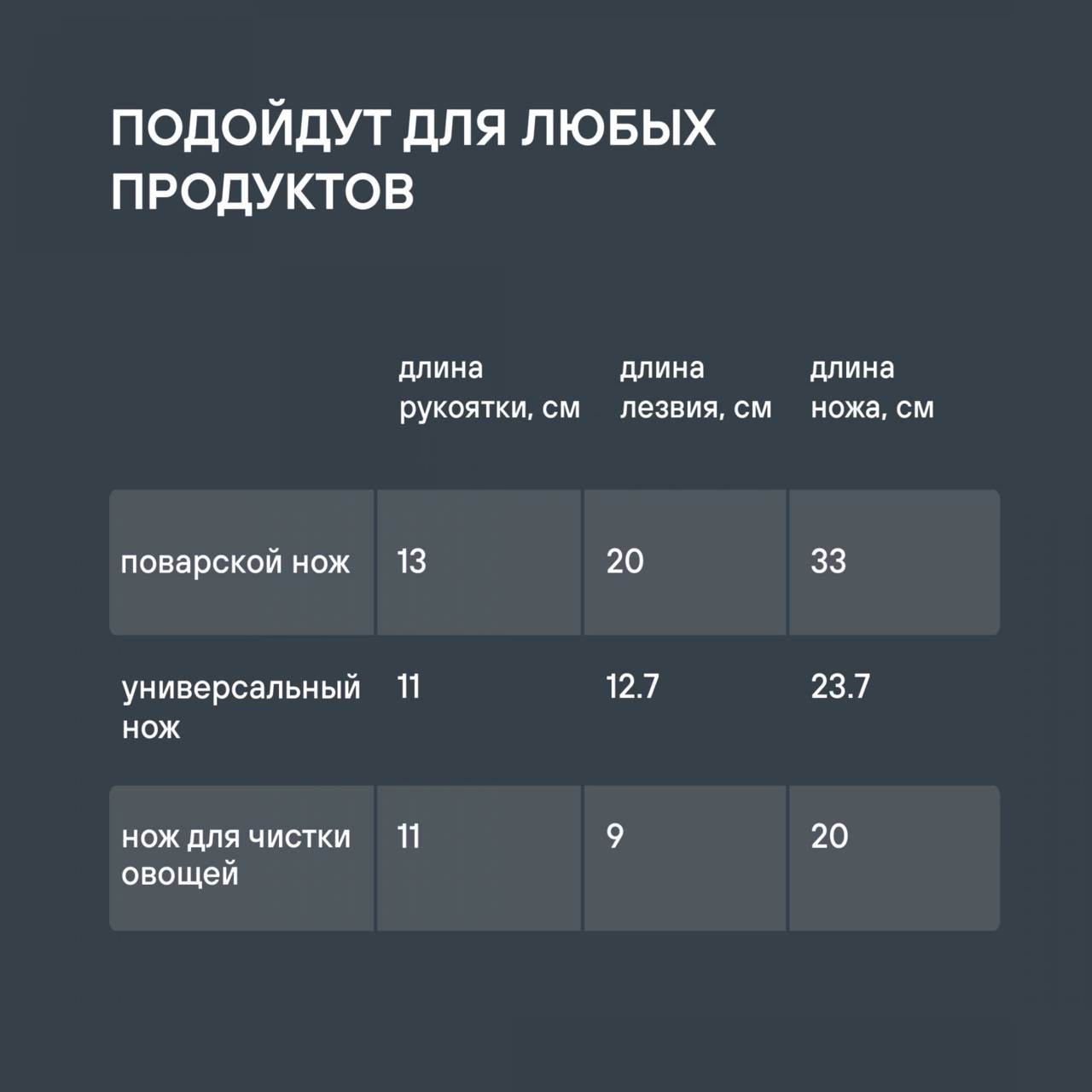 | Состав комплекта: | Нож для чистки овощей,разделочный,универсальный, разделочная доска |