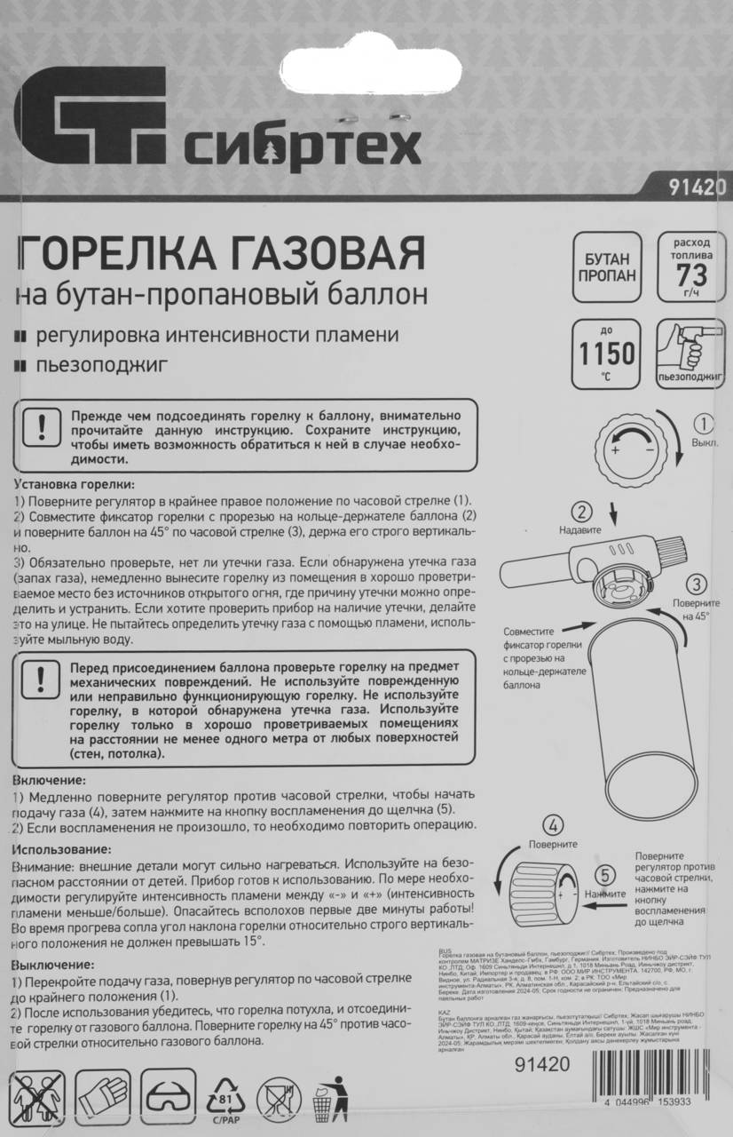 Паяльное оборудование СИБРТЕХ Паяльная горелка 91420 газов.