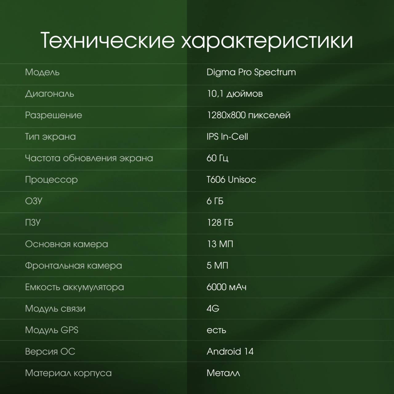Планшет DIGMA PRO Spectrum T606 8C RAM6Gb ROM128Gb 10.1" IPS 1280x800 4G Android 14 темно-серый 13Mpix 5Mpix BT WiFi microSD 512Gb 6000mAh 255hrs