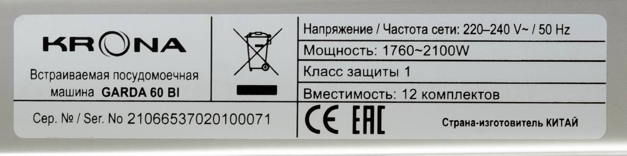 Посудомоечная машина KRONA GARDA 60 BI полноразмерная (КА-00001441)