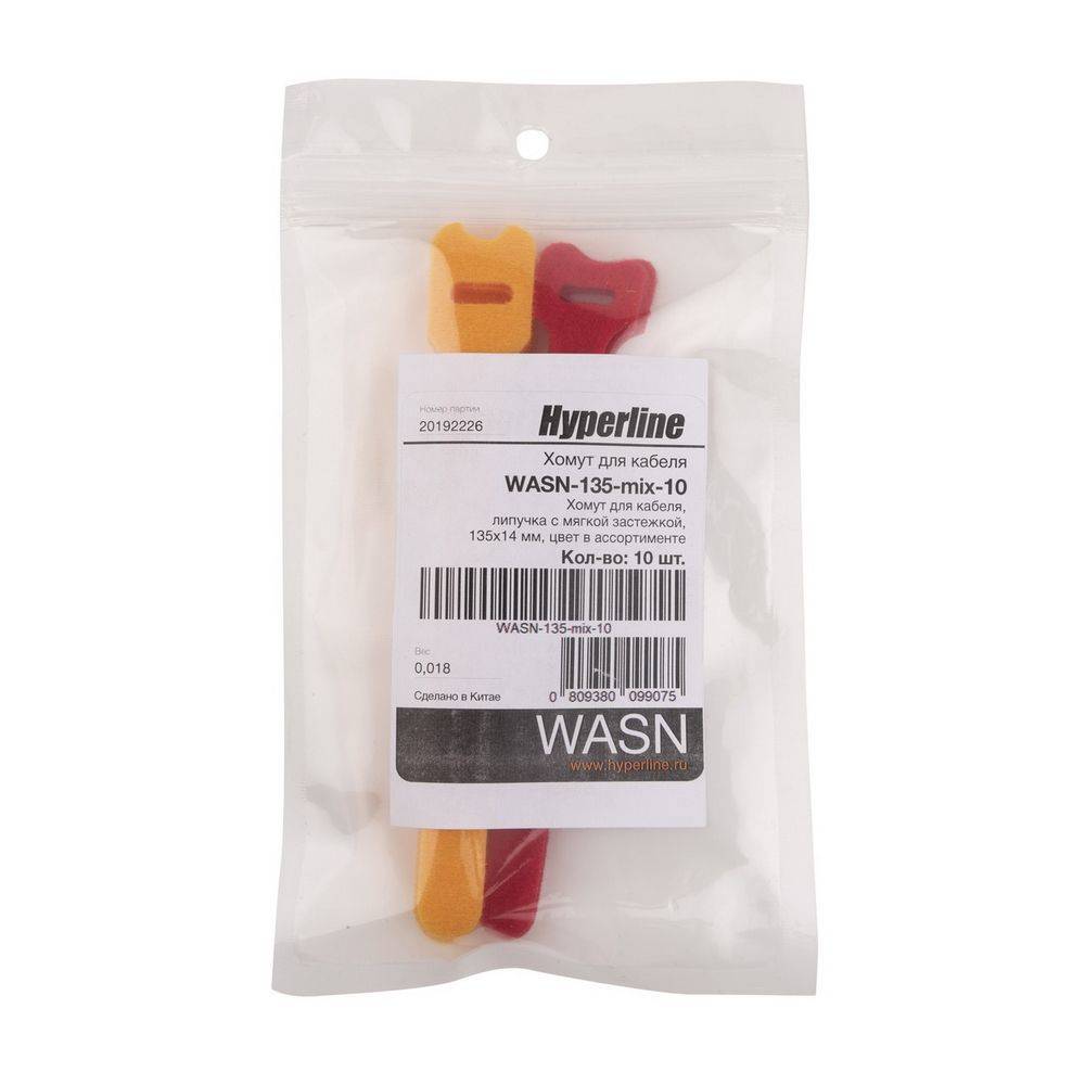 Серверный шкаф HYPERLINE Крепеж WASN-135-mix-10 Хомут для кабеля, липучка с мягкой застежкой, 135x14мм, цвет в ассортименте3490278-1