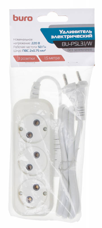 Сетевой фильтр BURO Сетевой удлинитель Buro BU-PSL3.1/W 1.5м (3 розетки) белый (пакет ПЭ) (BU-PSL3.1/W)