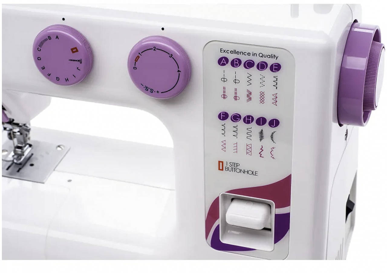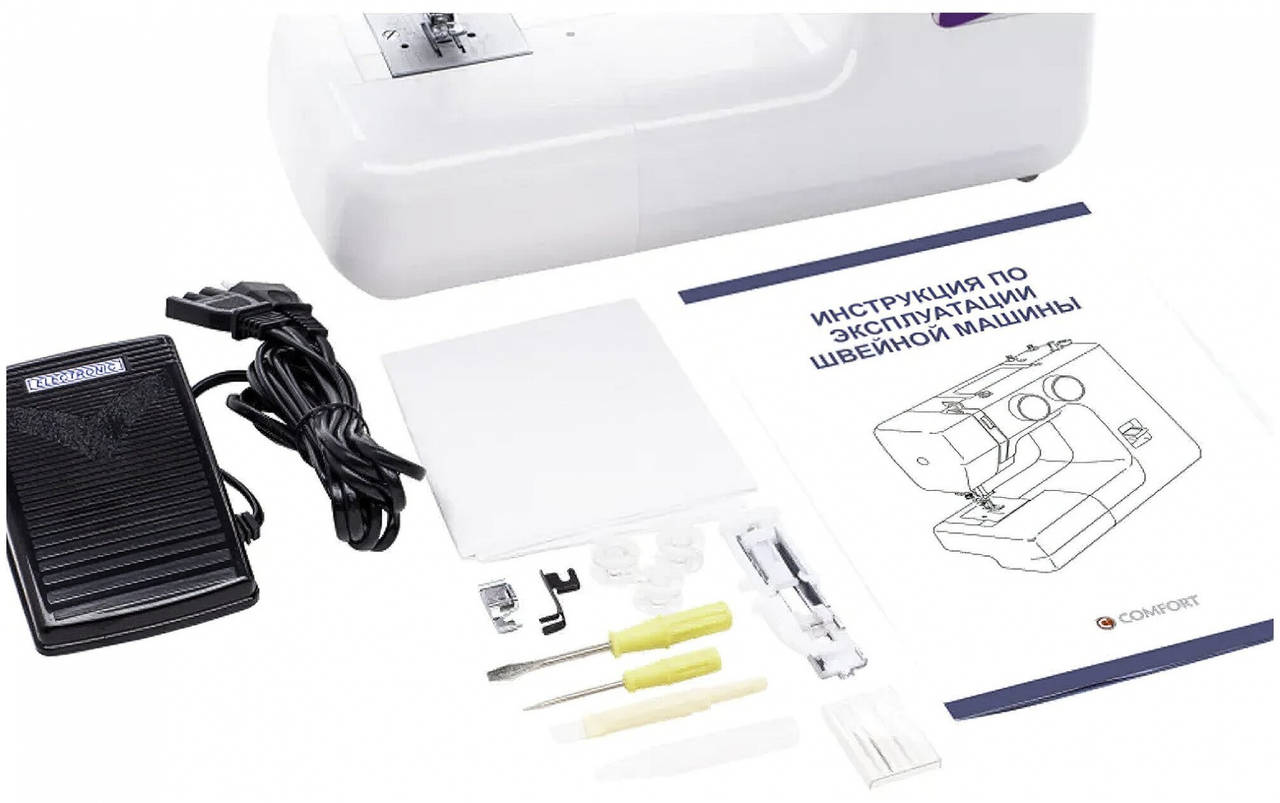Комплектация: | педаль, документация, шпульки, вспарыватель, набор игл |