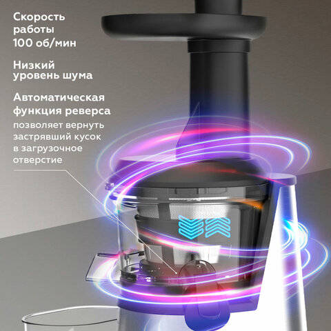 А для легкого извлечения застрявших продуктов в модели предусмотрена функция реверса. Система капля-стоп, и прорезиненные ножки делают эксплуатацию соковыжималки комфортной, а защита от перегрева, перегрузки и блокировка при неверной сборке и случайном включении обеспечивают надёжность, долговечность и высокую гигиеничность аппарата.