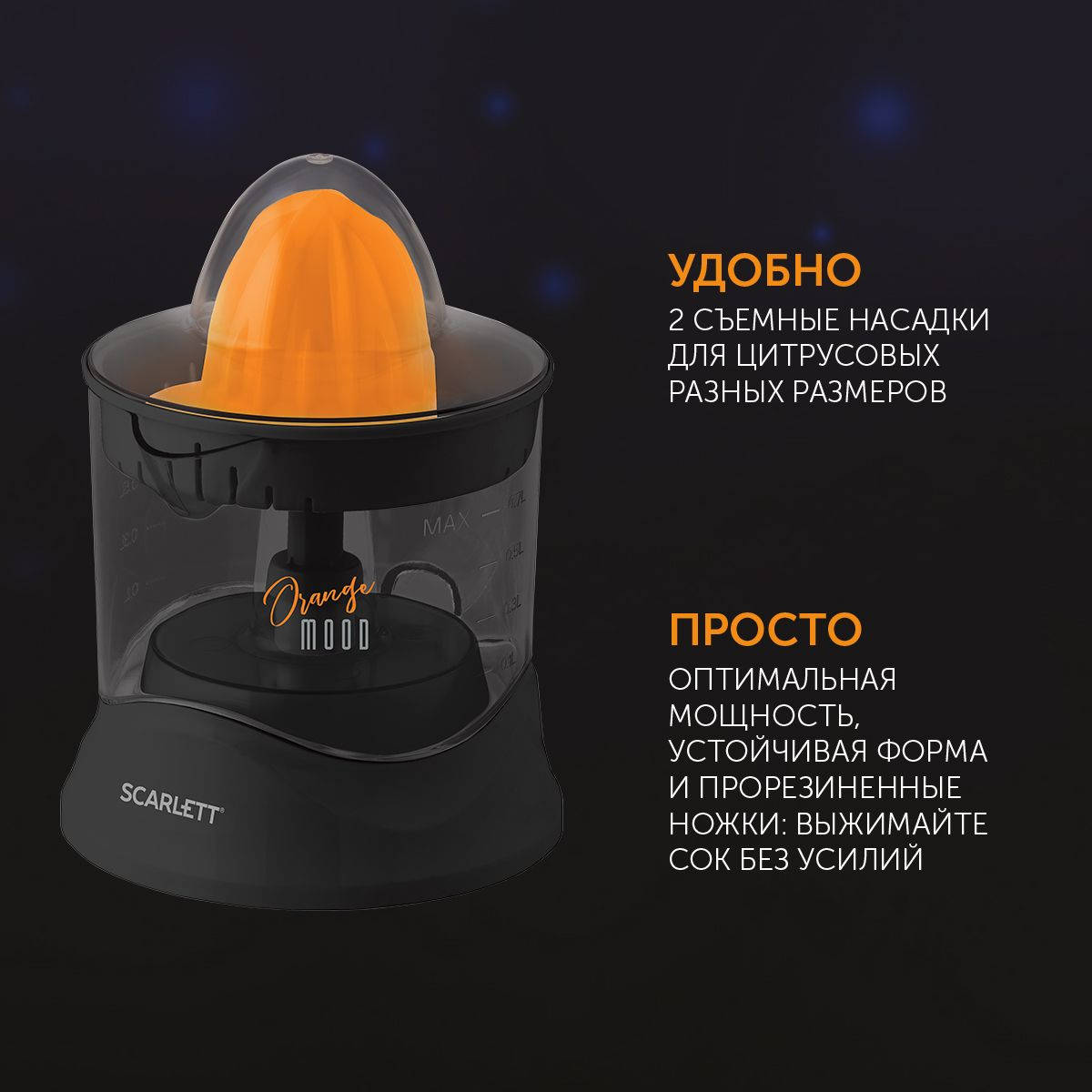 Соковыжималка SCARLETT цитрусовая SC-JE50C09 25Вт черный/оранжевый