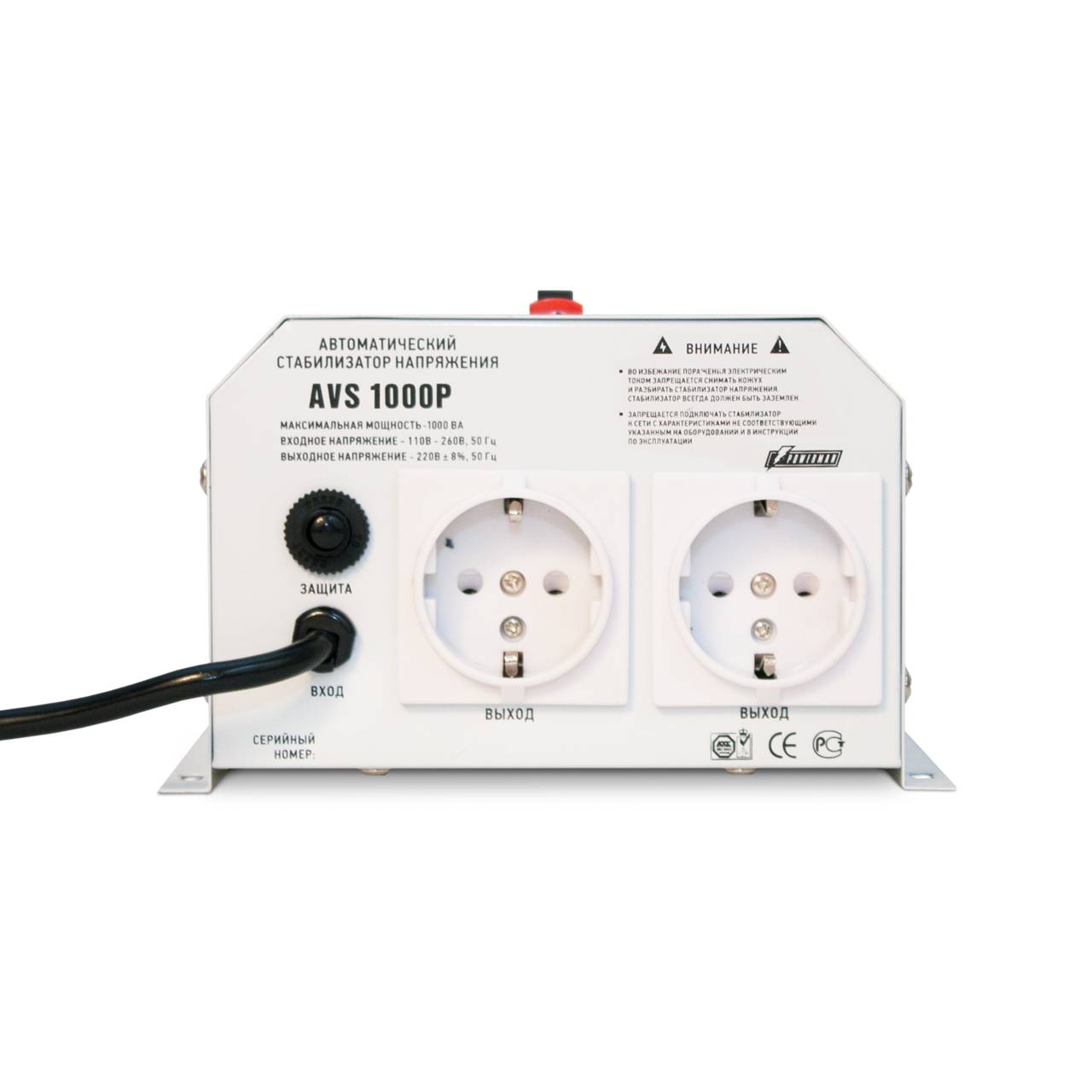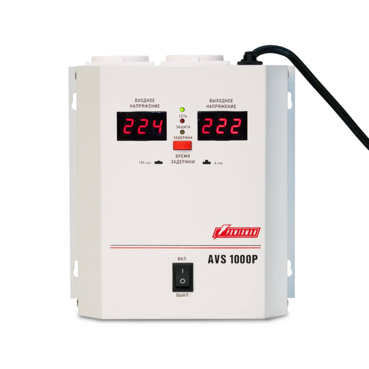 Сетевой стабилизатор PowerMan Stabilizer POWERMAN AVS 1000P, step-type regulator, digital indicators of voltage levels, 1000VA, 110-260V, maximum input current 7A, 2 eurosockets, IP-20, hinged, 185mm x 170mm x 100mm, 3.5 kg. POWERMAN AVS-1000P (POWERMAN AVS-1000P)