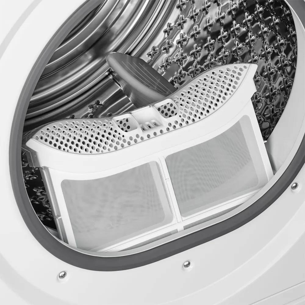 Барабан сушильной машины изготовлен из нержавеющей стали и имеет объём 118 литров, что позволяет загружать до 10 кг белья за один цикл.