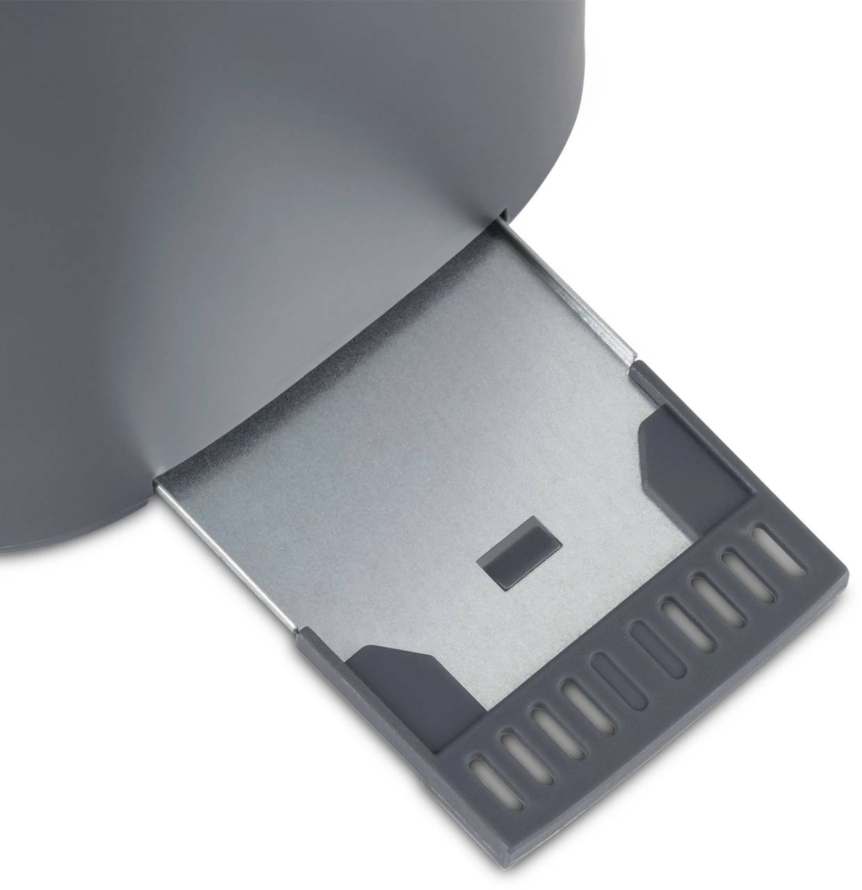 Компактный тостер со стандартными слотами для двух тостов, торцевое управление, трендовый серый цвет. Только тостер, все что нужно.
