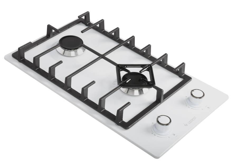 Варочная поверхность газовая. Цвет Белый. Габариты (ШхГхВ) 30х53х9,5см. Электророзжиг горелок, кнопка розжига на панели. Газ-контроль горелок стола. Фиксированное положение «малое пламя». Чугунные решетки горелок стола.